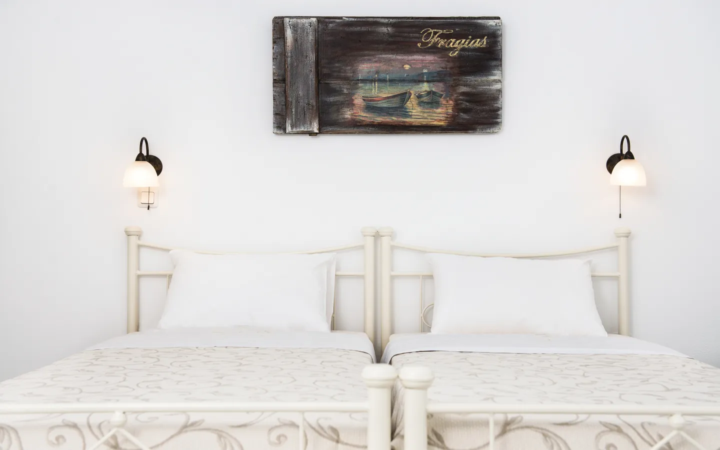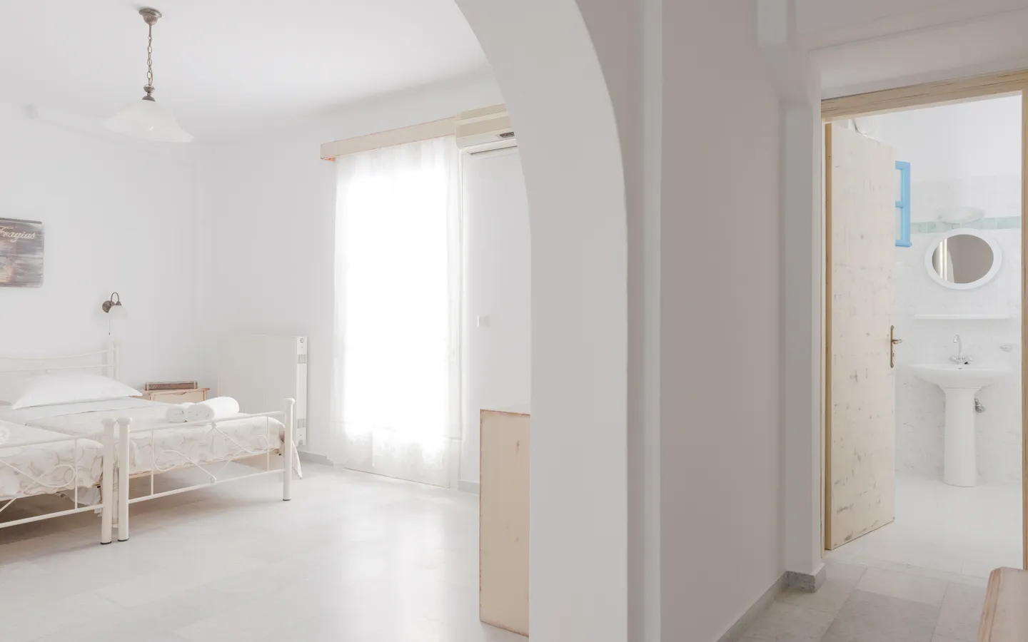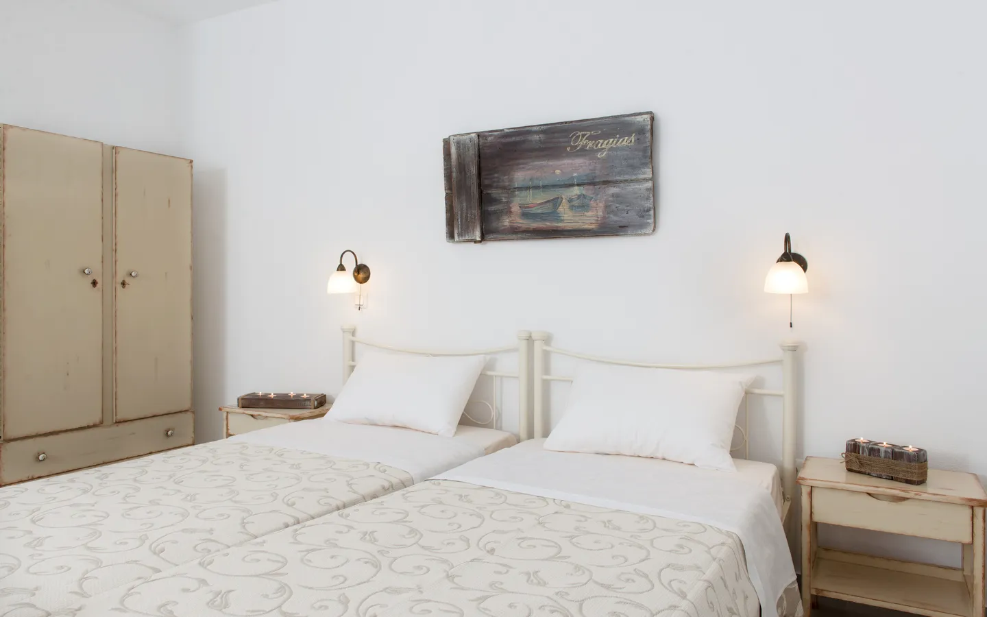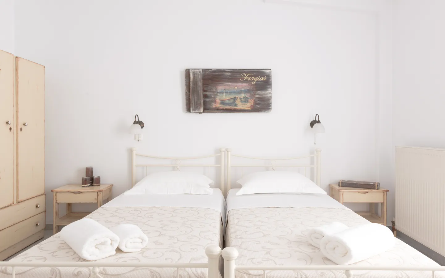 The room includes two single beds, a fully equipped kitchenette, and a modern bathroom with shower, along with all the essential amenities for a relaxing stay. Its central location makes it an ideal base for exploring Naxos Town, local restaurants, shops, and nearby beaches.
