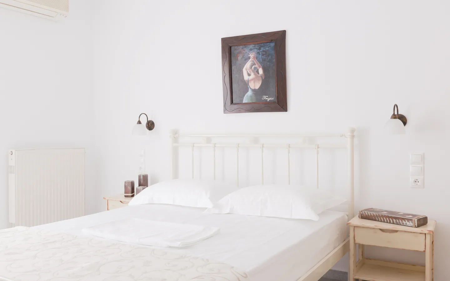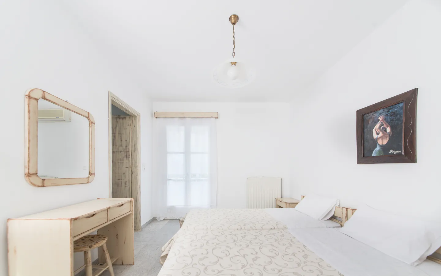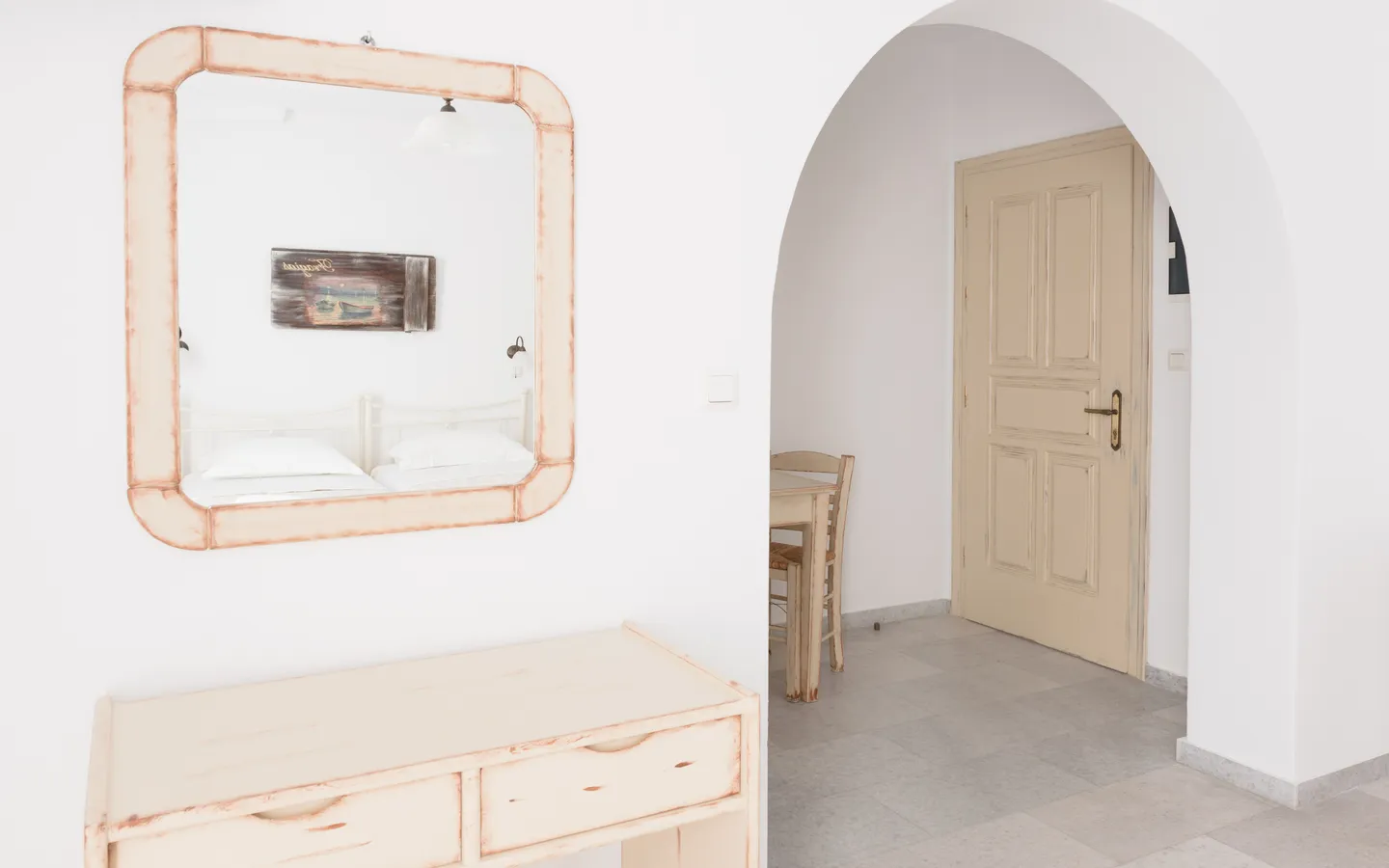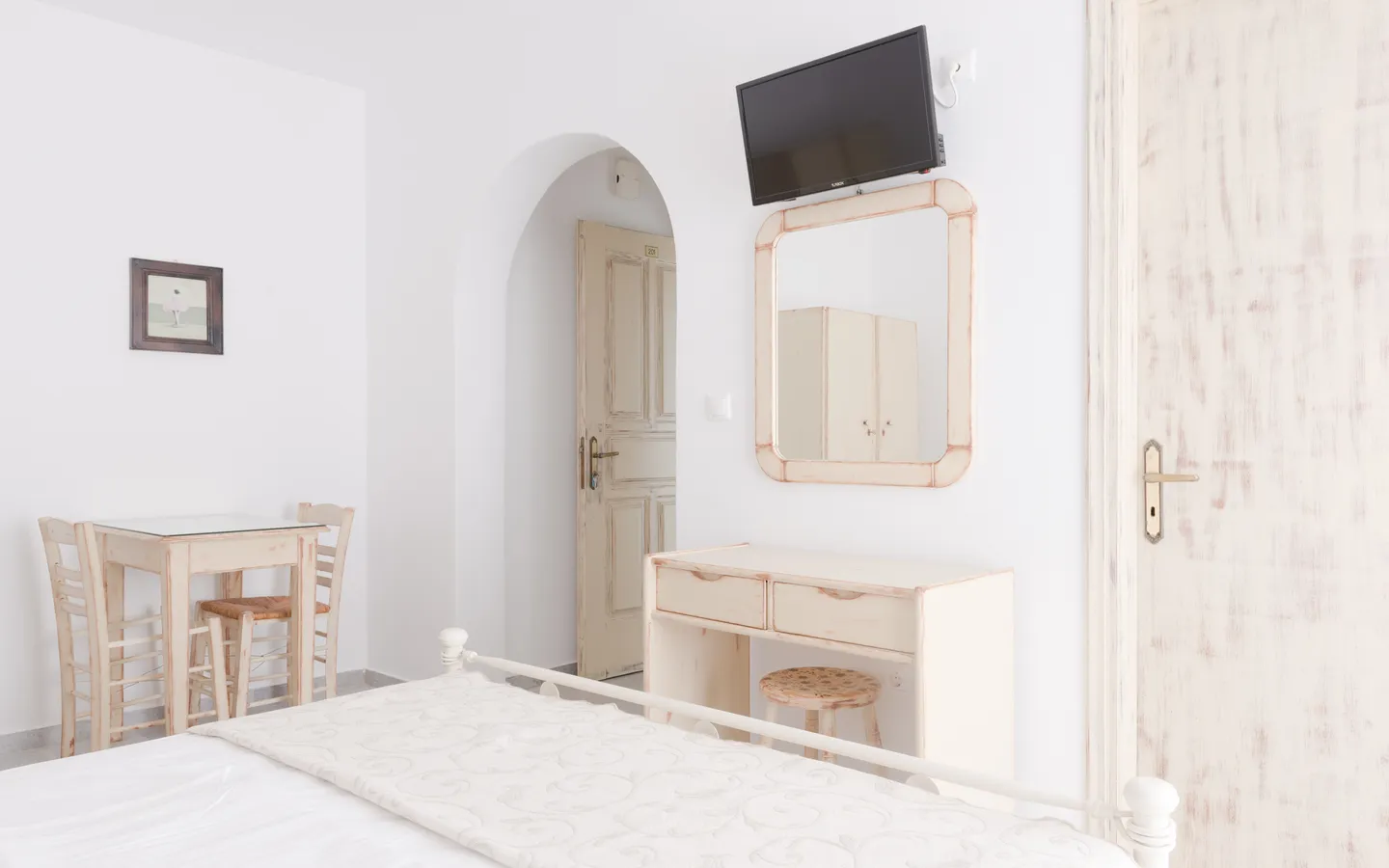 The room includes two single beds, a fully equipped kitchenette, and a modern bathroom with shower, along with all the essential amenities for a relaxing stay. Its central location makes it an ideal base for exploring Naxos Town, local restaurants, shops, and nearby beaches.