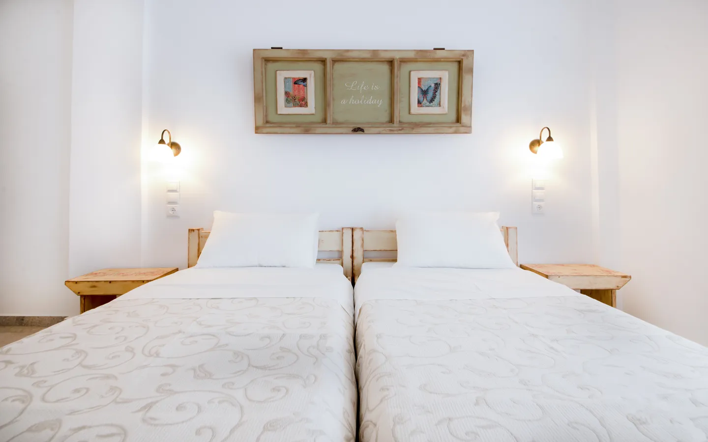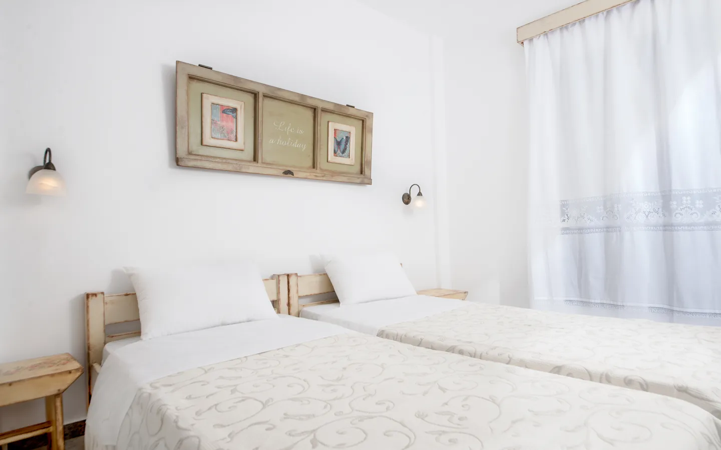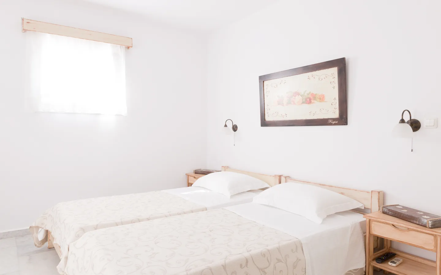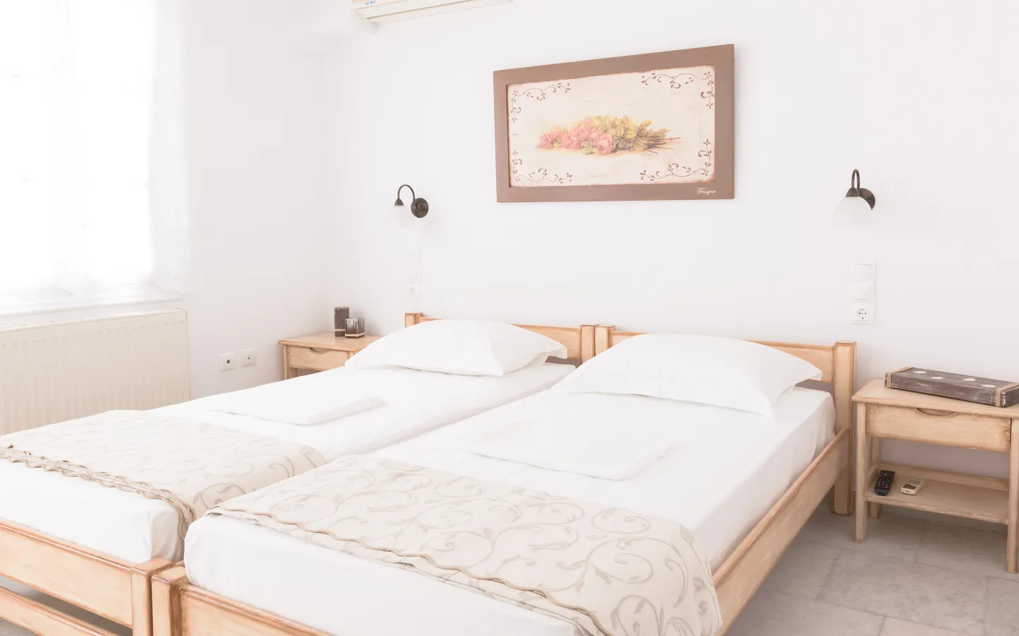 The Economy Double Room offers a comfortable accommodation option for couples or friends looking for a centrally located stay in Naxos. The room is located on the basement level of the property and features a balcony overlooking the quiet inner courtyard, providing a peaceful atmosphere just minutes from the town center.