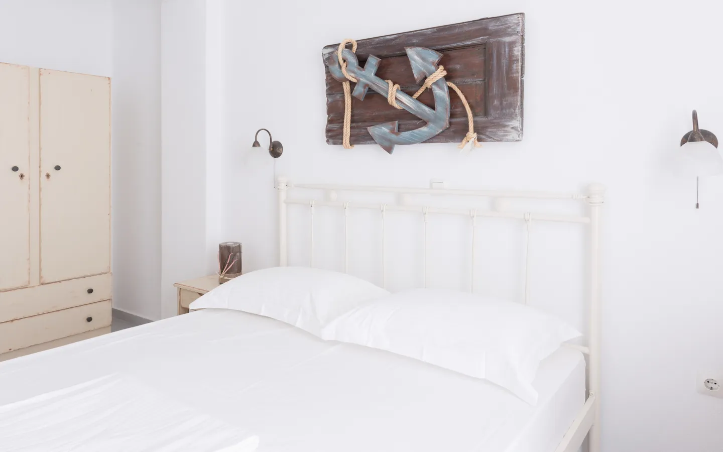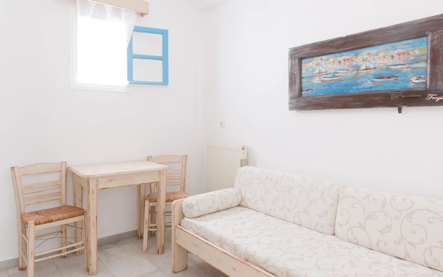 The One-Bedroom Family Apartment is ideal for small families seeking comfort and privacy during their stay in Naxos. Located on the second floor, the apartment features a separate bedroom with a double bed and a private balcony.